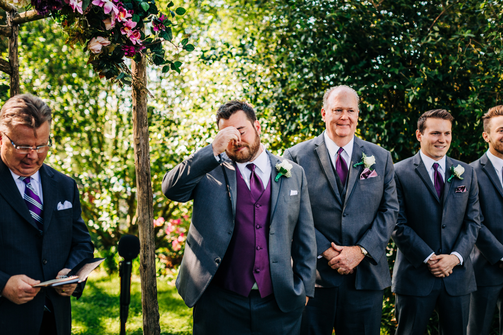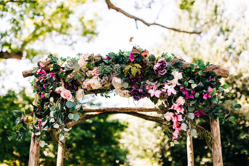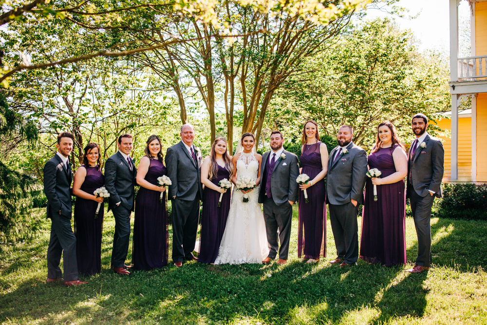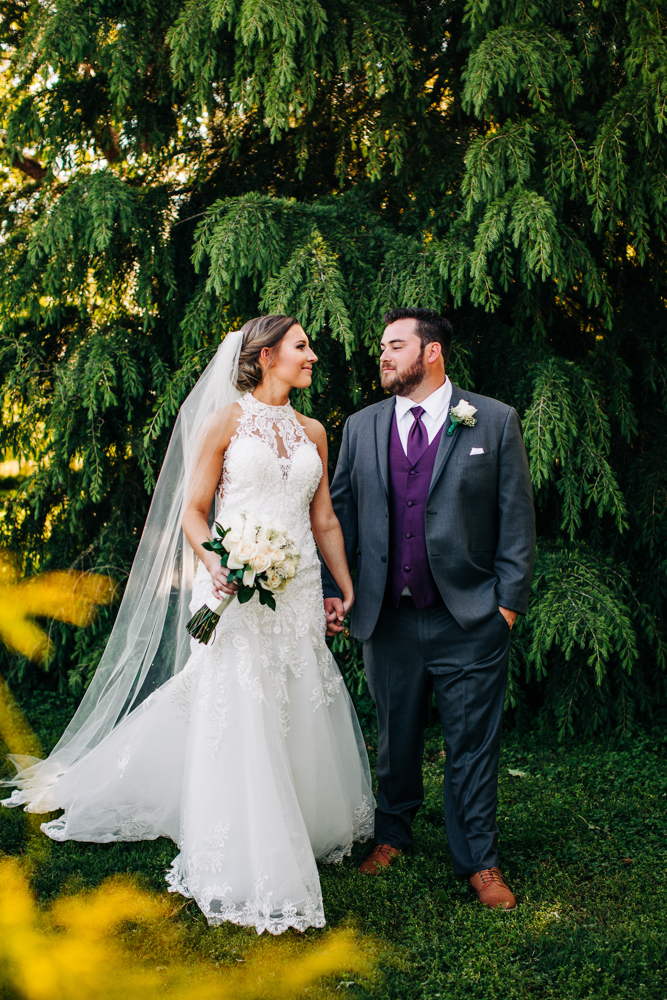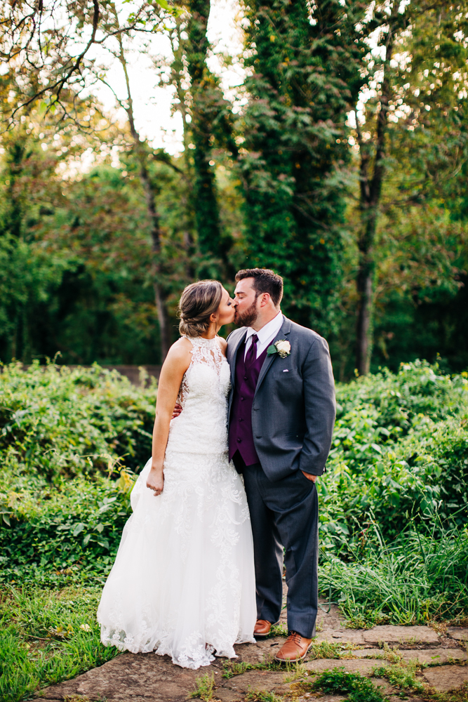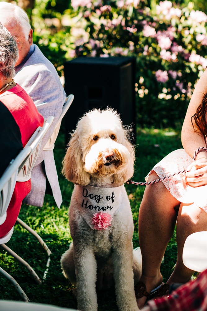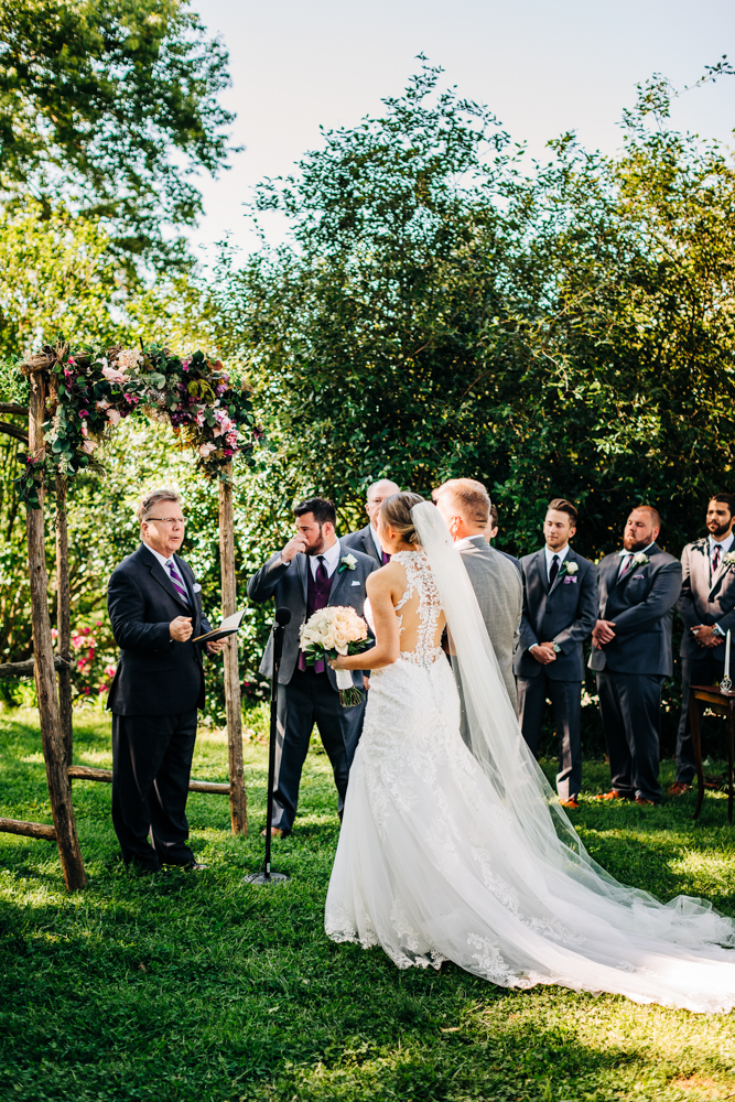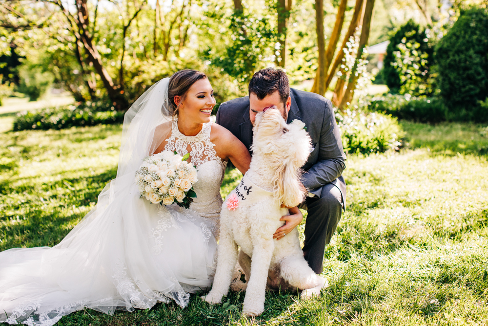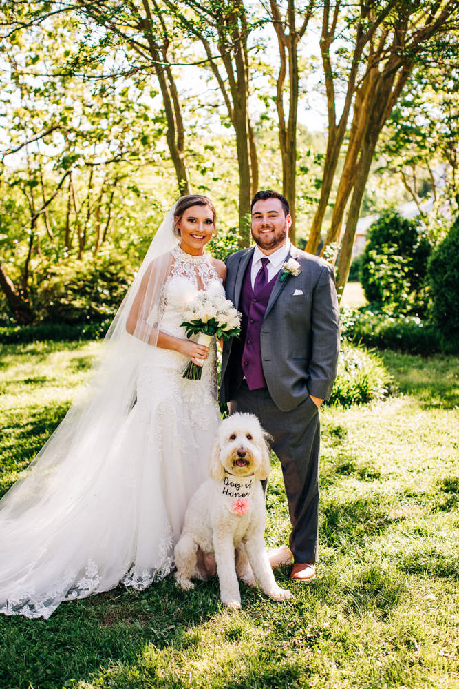 I’m obsessed with Jessica’s dress! Late April is the perfect time for a gorgeous and green background! I had promised them perfect weather and they got it! Jessica’s therapy dog was trimmed and gorgeous for the ceremony. The wood arbor had plum and cream silk decor provided by the 1812 Hitching Post.