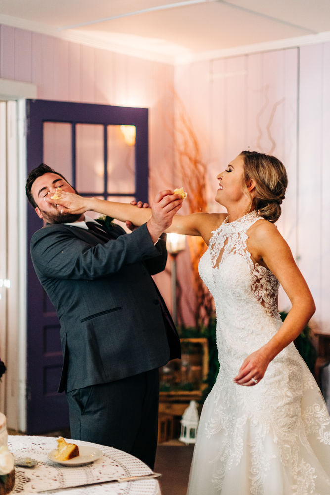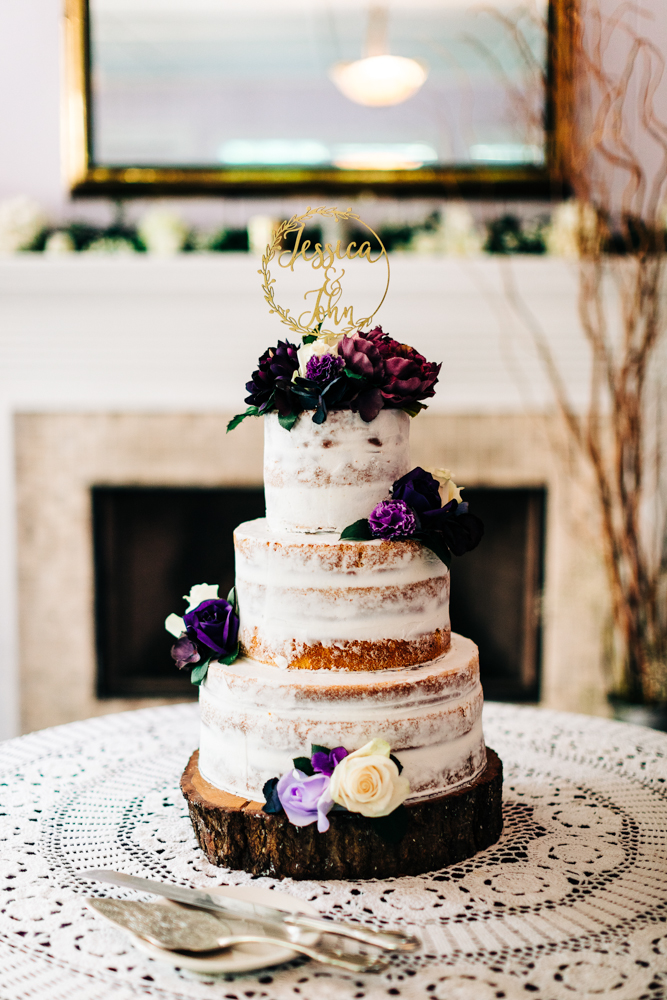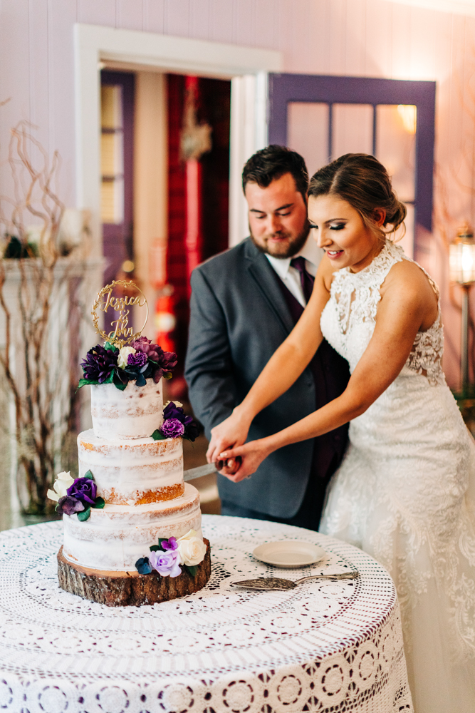 We used plum and cream lace to decorate for the reception. They gave apple butter in mason jars as their party favors. The “almost” naked cake was provided by the 1812 Hitching Post bakery.